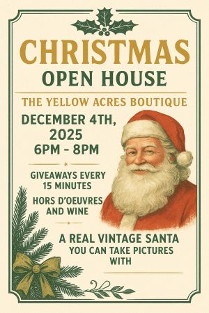 Enjoy a festive evening at The Yellow Acres Boutique on Thursday, December 4, from 6–8 p.m., featuring holiday giveaways, hors d’oeuvres, wine, and photo opportunities with Santa.
